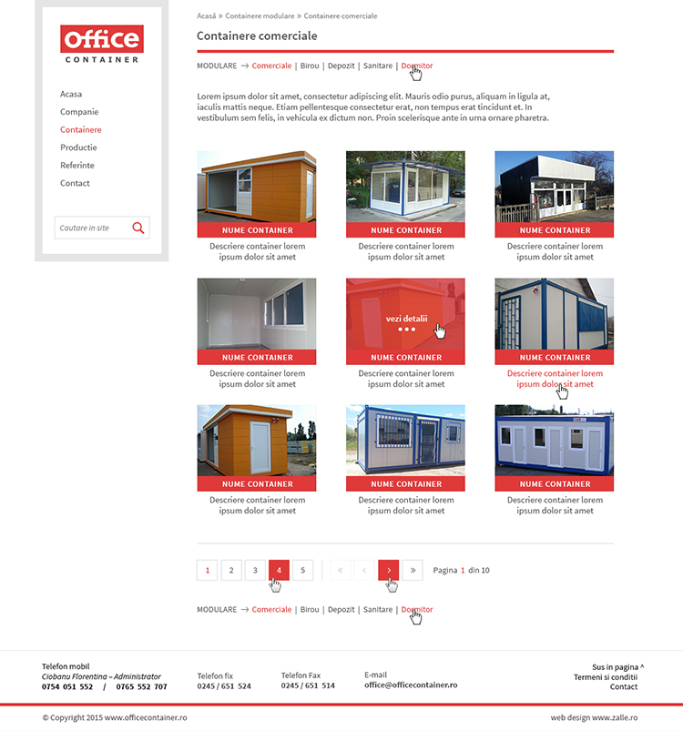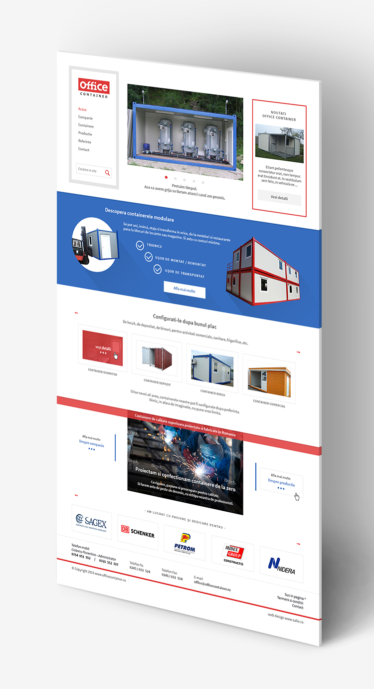 Office container is a catalog website with a simple, but impactful home page. The website contains the essential elements required for a catalog and the side menu provides a clear hierarchy of how the website is structured.